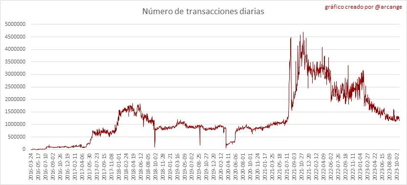 Este gráfico muestra la cantidad de usuarios recién registrados en la blockchain y cuántos de ellos son activos. ¡El gráfico es algo dinámico! Un usuario puede registrarse un día y volverse activo unos días después. por lo que los datos pueden cambiar de un día a otro.
