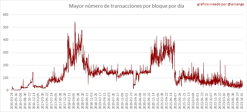 Estos gráficos muestran la cantidad de transacciones por día, la cantidad más alta de transacciones por bloque, la cantidad promedia de transacciones por bloque y la cantidad de transacciones por bloque durante las últimas 48 horas. Esto le da una idea de toda la actividad en la blockchain.