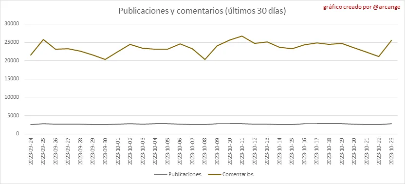 Estos gráficos muestran la evolución de publicaciones y comentarios durante toda la vida útil de la blockchain y durante los últimos 30 días.