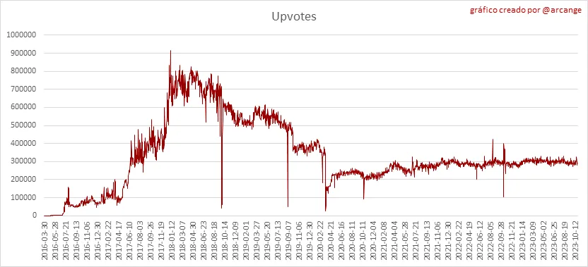Estos gráficos muestran la evolución de la curación (upvotes) durante toda la vida útil de la blockchain y durante los últimos 30 días.