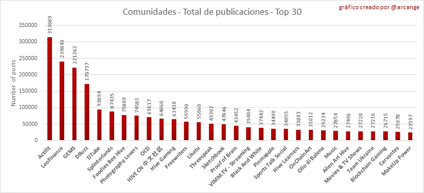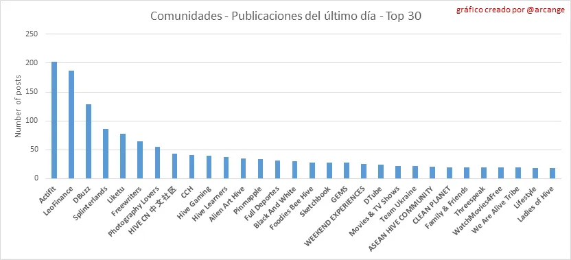 Estos gráficos muestran las comunidades más activas por número de publicaciones (vida útil de blockchain y último día).