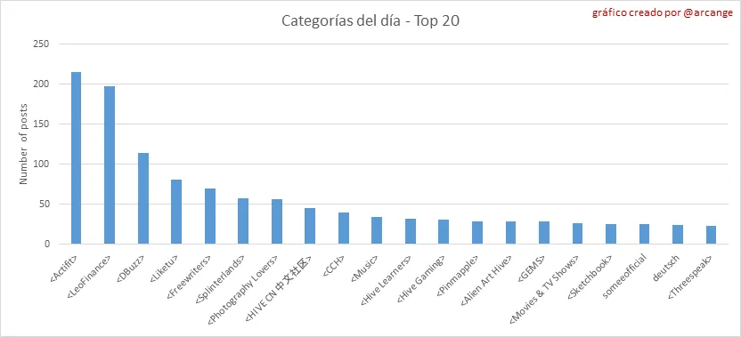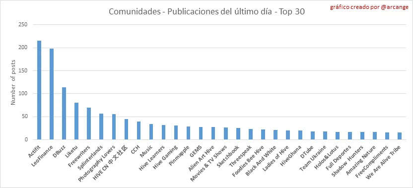 Estos gráficos muestran las comunidades más activas por número de publicaciones (vida útil de blockchain y último día).