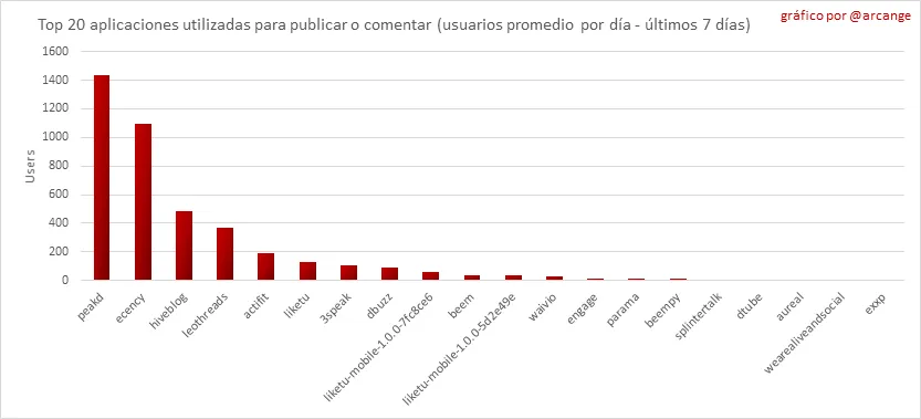 Este gráfico muestra qué aplicaciones se utilizan más para publicar posts y comentarios. Tenga en cuenta que el mismo usuario puede utilizar varias aplicaciones diferentes.