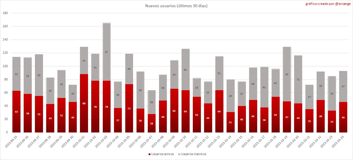 Estos dos gráficos muestran quién creó nuevas cuentas durante el último día y el número total de cuentas registradas. La línea roja muestra cuántas de ellas han estado activas al menos una vez (activa significa publicar un post, comentar o votar). Están incluidas incluso si se vuelven inactivos más tarde.