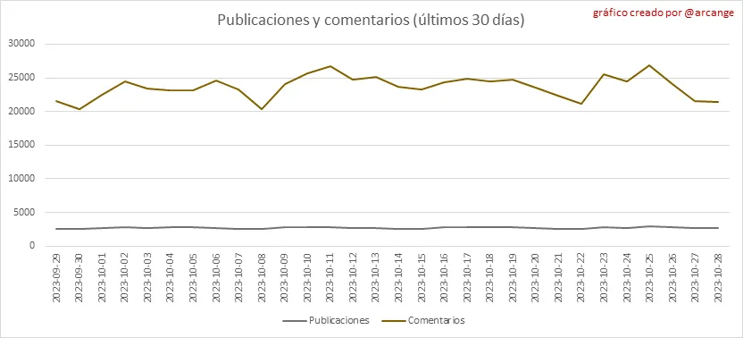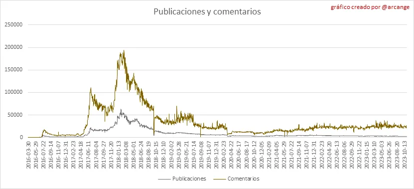 Estos gráficos muestran la evolución de publicaciones y comentarios durante toda la vida útil de la blockchain y durante los últimos 30 días.