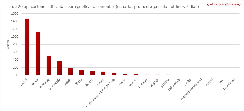 Este gráfico muestra qué aplicaciones se utilizan más para publicar posts y comentarios. Tenga en cuenta que el mismo usuario puede utilizar varias aplicaciones diferentes.