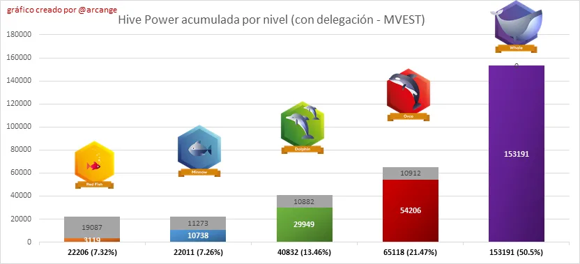 Este gráfico muestra la distribución de Hive Power acumulada por nivel de cuenta. El gráfico de la izquierda muestra la distribución sin tener en cuenta ninguna delegación realizada o recibida por las cuentas. Los gráficos de la derecha tienen en cuenta la delegación, agrega la delegación de HP recibida y resta la delegación de HP dada.