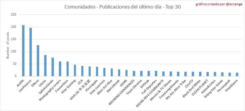Estos gráficos muestran las comunidades más activas por número de publicaciones (vida útil de blockchain y último día).