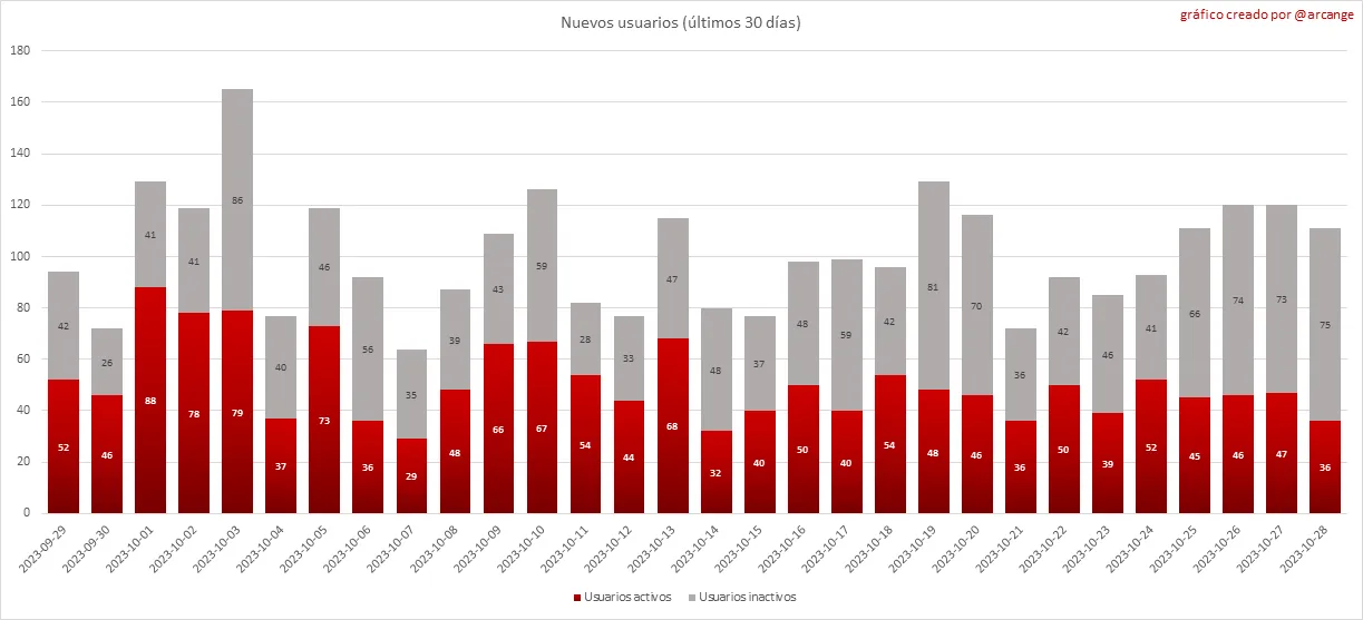 Estos dos gráficos muestran quién creó nuevas cuentas durante el último día y el número total de cuentas registradas. La línea roja muestra cuántas de ellas han estado activas al menos una vez (activa significa publicar un post, comentar o votar). Están incluidas incluso si se vuelven inactivos más tarde.