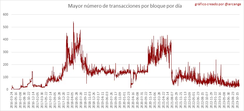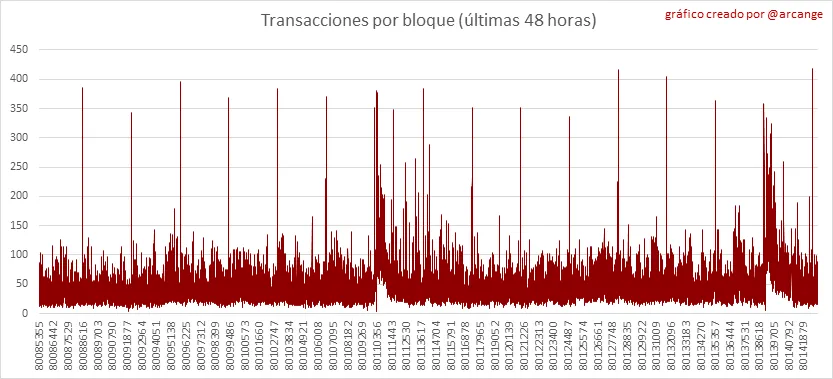 Estos gráficos muestran la cantidad de transacciones por día, la cantidad más alta de transacciones por bloque, la cantidad promedia de transacciones por bloque y la cantidad de transacciones por bloque durante las últimas 48 horas. Esto le da una idea de toda la actividad en la blockchain.