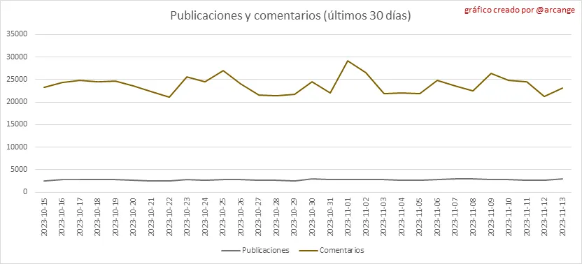Estos gráficos muestran la evolución de publicaciones y comentarios durante toda la vida útil de la blockchain y durante los últimos 30 días.
