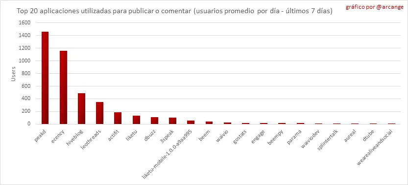 Este gráfico muestra qué aplicaciones se utilizan más para publicar posts y comentarios. Tenga en cuenta que el mismo usuario puede utilizar varias aplicaciones diferentes.