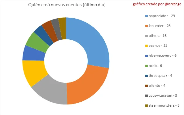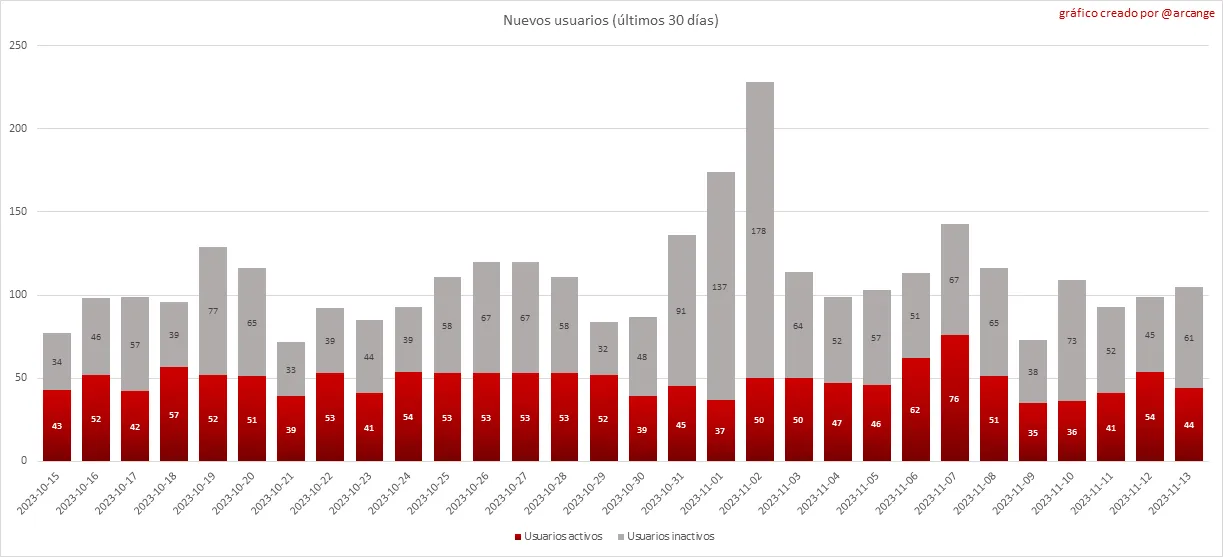 Estos dos gráficos muestran quién creó nuevas cuentas durante el último día y el número total de cuentas registradas. La línea roja muestra cuántas de ellas han estado activas al menos una vez (activa significa publicar un post, comentar o votar). Están incluidas incluso si se vuelven inactivos más tarde.
