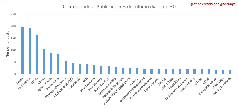 Estos gráficos muestran las comunidades más activas por número de publicaciones (vida útil de blockchain y último día).