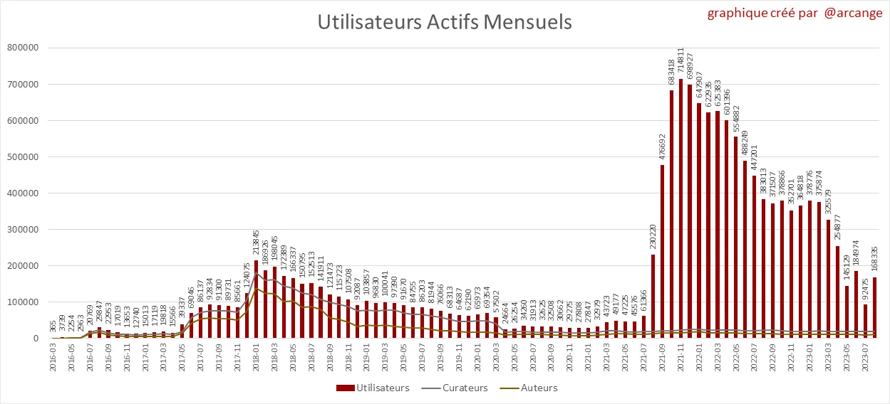 Le dernier graphique est un résumé mensuel des utilisateurs actifs. Attention en interpretant la valeur de la dernière colonne qui peut être largement inférieure si la fin du mois n'a pas encore été atteinte.