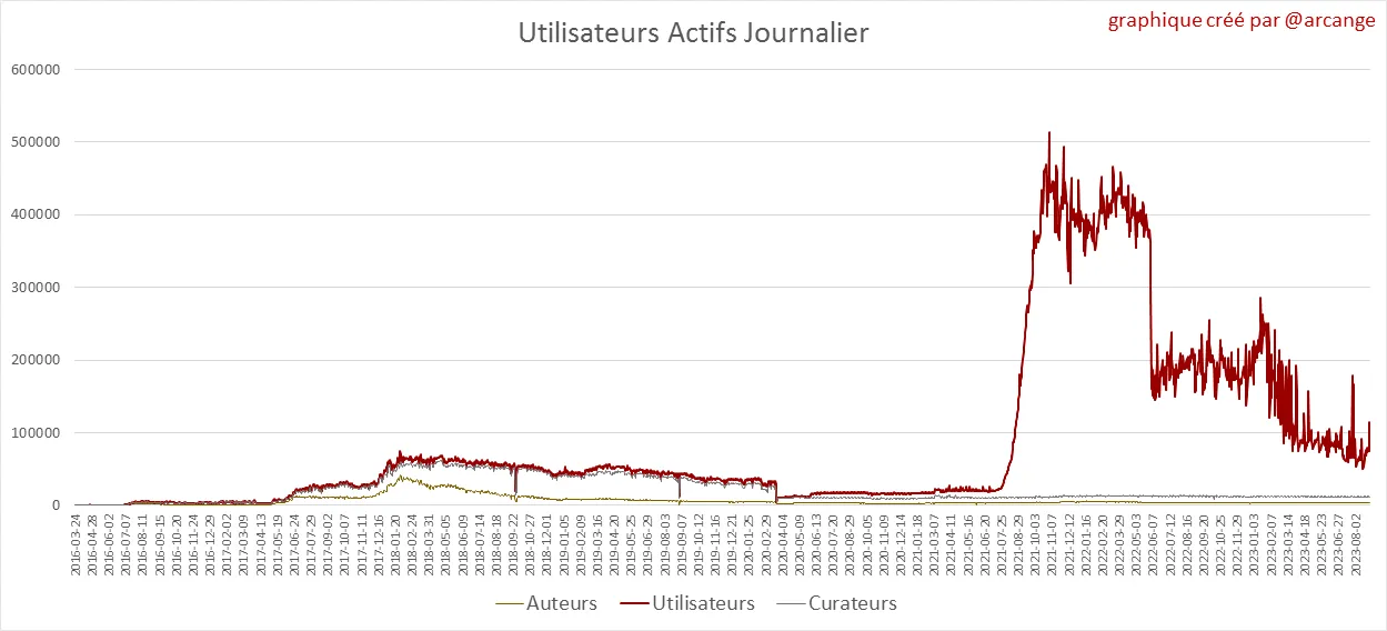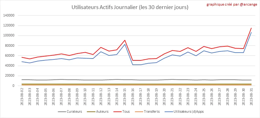Toutes les informations présentées dans ce rapport sont basées sur les données collectées dans la blockchain jusqu'au 31-08-2023 à minuit, heure UTC. L'objectif de ce rapport est de vous fournir une vision claire de ce qui se passe quotidiennement dans la blockchain Hive.