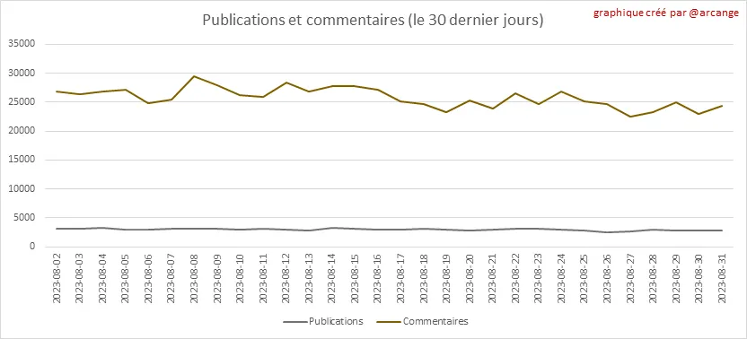 Ces graphiques montrent l'évolution des publications et des commentaires pour toute la durée de vie de la blockchain et pour les 30 derniers jours.