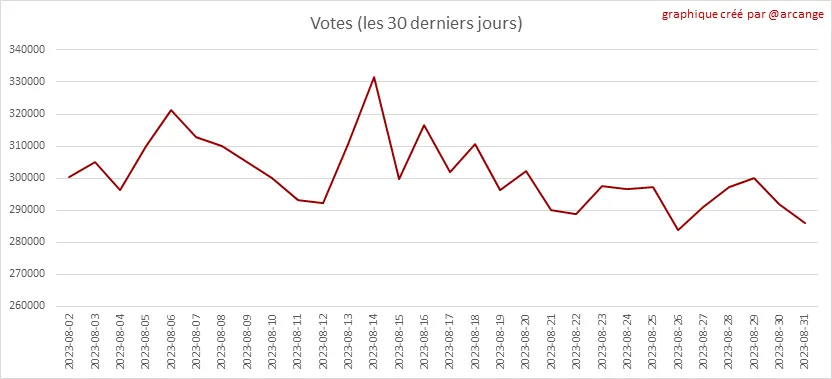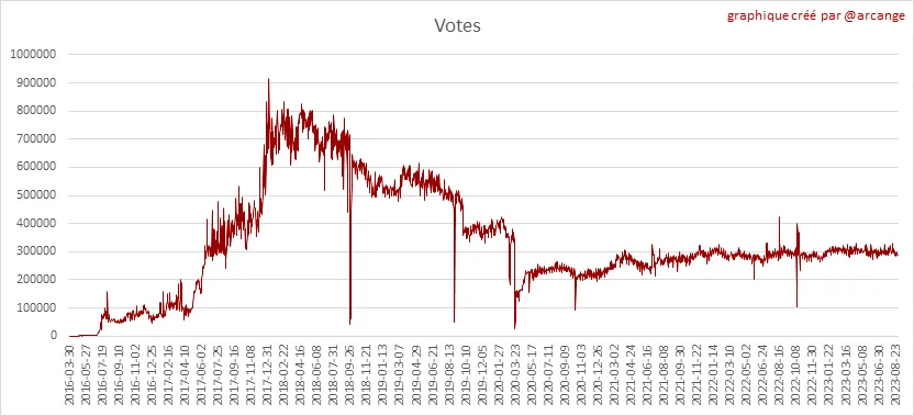 Ces graphiques montrent l'évolution de la curation (votes positifs) depuis la création de la blockchain et pour les 30 derniers jours.
