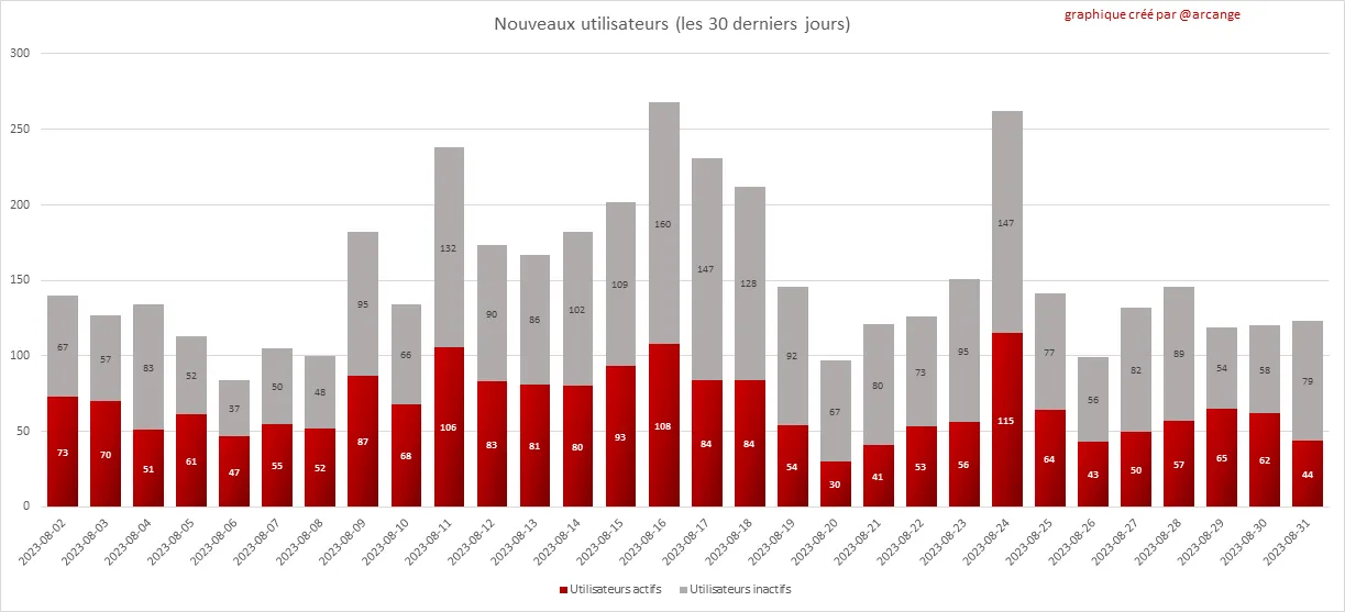 La partie grise de chaque colonne indique le nombre de comptes inactifs (ceux qui n'ont plus publié, commenté ou voté depuis 30 jours).
