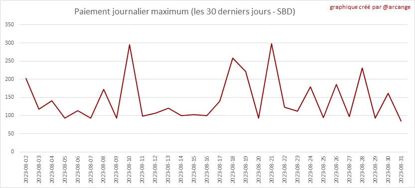 Ce graphique montrent la récompense maximale payée sur un message (ou un commentaire) au cours des 30 derniers jours.