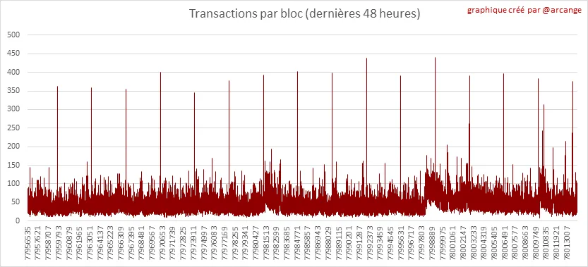 Ces graphiques montrent le nombre de transactions par jour, le nombre le plus élevé de transactions par bloc, le nombre moyen de transactions par bloc et le nombre de transactions par bloc au cours des 48 dernières heures. Cela vous donne une idée de toute l'activité sur la blockchain.