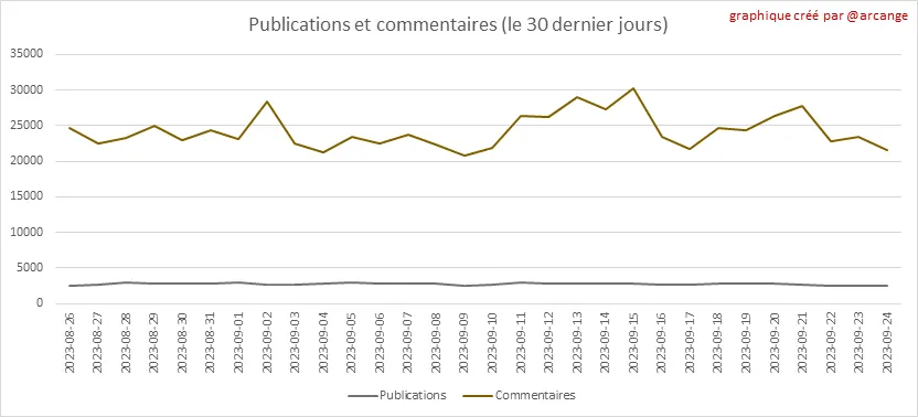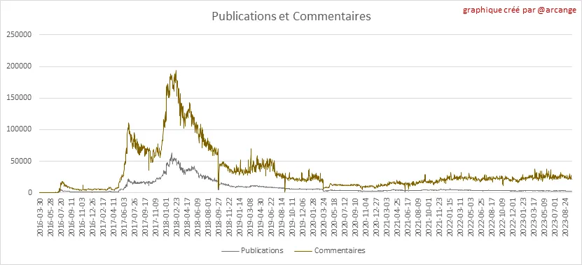 Ces graphiques montrent l'évolution des publications et des commentaires pour toute la durée de vie de la blockchain et pour les 30 derniers jours.