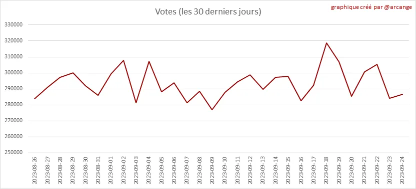 Ces graphiques montrent l'évolution de la curation (votes positifs) depuis la création de la blockchain et pour les 30 derniers jours.
