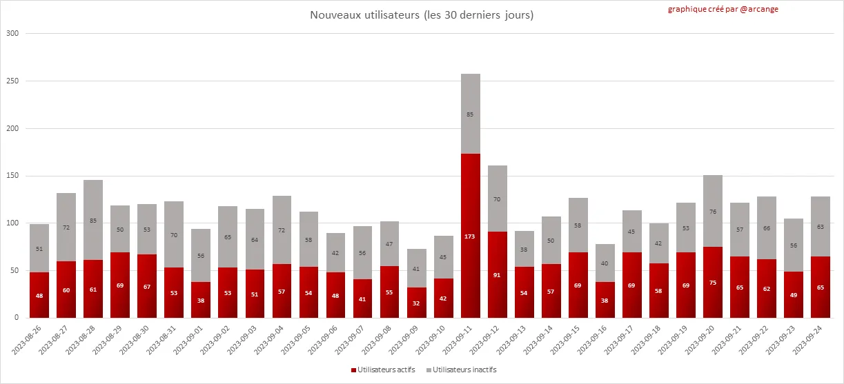 La partie grise de chaque colonne indique le nombre de comptes inactifs (ceux qui n'ont plus publié, commenté ou voté depuis 30 jours).
