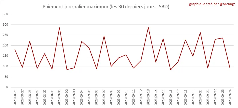 Ce graphique montrent la récompense maximale payée sur un message (ou un commentaire) au cours des 30 derniers jours.