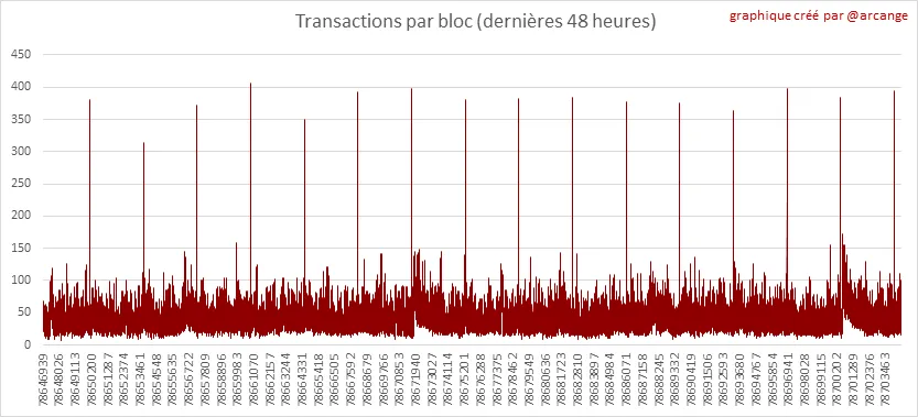 Ces graphiques montrent le nombre de transactions par jour, le nombre le plus élevé de transactions par bloc, le nombre moyen de transactions par bloc et le nombre de transactions par bloc au cours des 48 dernières heures. Cela vous donne une idée de toute l'activité sur la blockchain.
