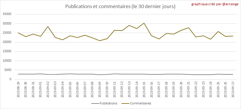 Ces graphiques montrent l'évolution des publications et des commentaires pour toute la durée de vie de la blockchain et pour les 30 derniers jours.