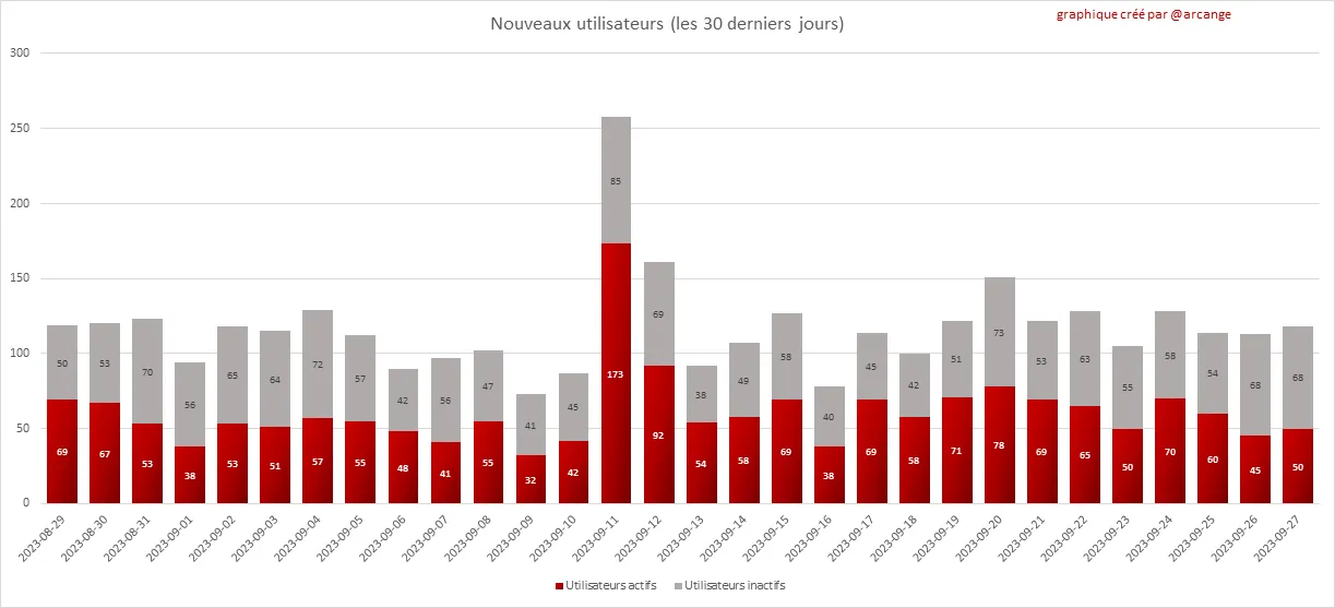 La partie grise de chaque colonne indique le nombre de comptes inactifs (ceux qui n'ont plus publié, commenté ou voté depuis 30 jours).