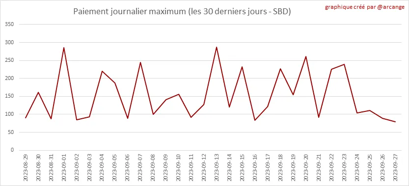 Ce graphique montrent la récompense maximale payée sur un message (ou un commentaire) au cours des 30 derniers jours.