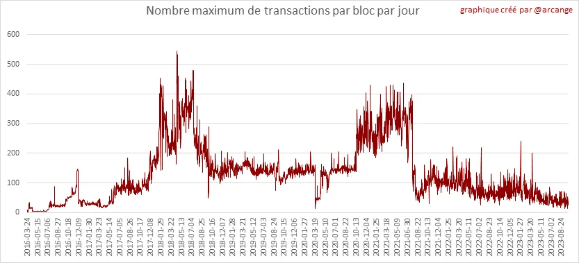 Ces graphiques montrent le nombre de transactions par jour, le nombre le plus élevé de transactions par bloc, le nombre moyen de transactions par bloc et le nombre de transactions par bloc au cours des 48 dernières heures. Cela vous donne une idée de toute l'activité sur la blockchain.