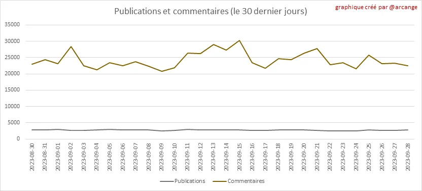 Ces graphiques montrent l'évolution des publications et des commentaires pour toute la durée de vie de la blockchain et pour les 30 derniers jours.