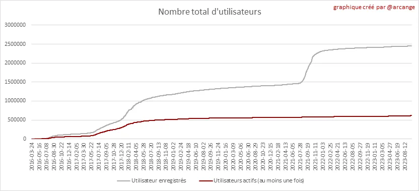 Le dernier graphique est un résumé mensuel des utilisateurs actifs. Attention en interpretant la valeur de la dernière colonne qui peut être largement inférieure si la fin du mois n'a pas encore été atteinte.