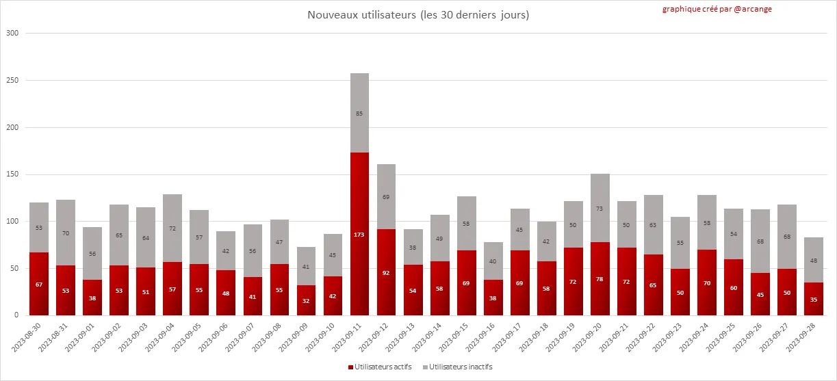 La partie grise de chaque colonne indique le nombre de comptes inactifs (ceux qui n'ont plus publié, commenté ou voté depuis 30 jours).