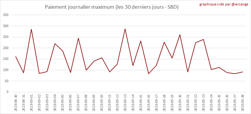 Ce graphique montrent la récompense maximale payée sur un message (ou un commentaire) au cours des 30 derniers jours.