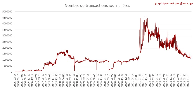 Ce graphique montre le nombre d'utilisateurs nouvellement inscrits sur la blockchain et combien d'entre eux sont devenus actifs. Nous voyons que beaucoup de comptes sont enregistrés, mais jamais utilisés. Ce graphique est un peu dynamique! Un utilisateur peut s'inscrire un jour et ne devenir actif que quelques jours plus tard. Par conséquent, le nombre d'utilisateurs actifs à une date donnée peut varier d'un jour à l'autre.