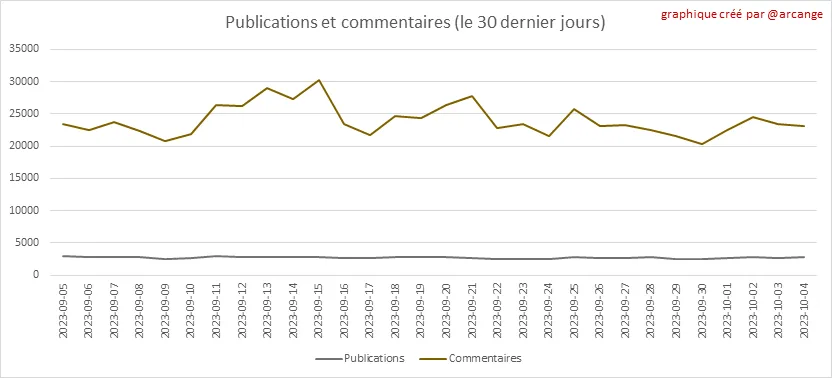 Ces graphiques montrent l'évolution des publications et des commentaires pour toute la durée de vie de la blockchain et pour les 30 derniers jours.