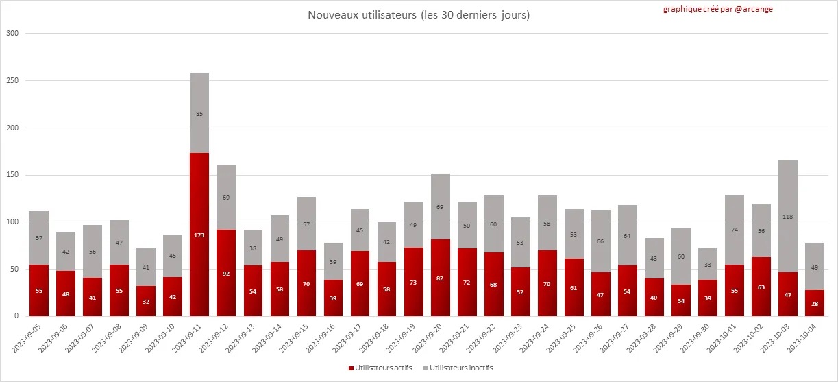 La partie grise de chaque colonne indique le nombre de comptes inactifs (ceux qui n'ont plus publié, commenté ou voté depuis 30 jours).