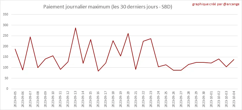Ce graphique montrent la récompense maximale payée sur un message (ou un commentaire) au cours des 30 derniers jours.