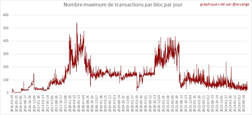 Ces graphiques montrent le nombre de transactions par jour, le nombre le plus élevé de transactions par bloc, le nombre moyen de transactions par bloc et le nombre de transactions par bloc au cours des 48 dernières heures. Cela vous donne une idée de toute l'activité sur la blockchain.