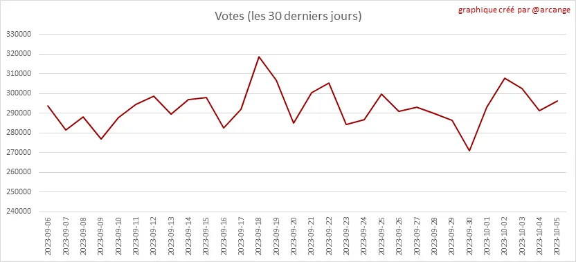 Ces graphiques montrent l'évolution de la curation (votes positifs) depuis la création de la blockchain et pour les 30 derniers jours.
