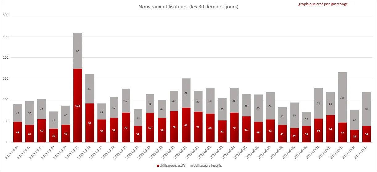 La partie grise de chaque colonne indique le nombre de comptes inactifs (ceux qui n'ont plus publié, commenté ou voté depuis 30 jours).