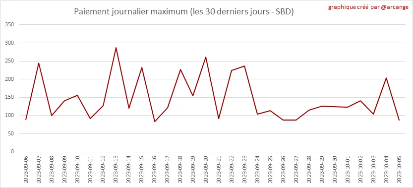 Ce graphique montrent la récompense maximale payée sur un message (ou un commentaire) au cours des 30 derniers jours.