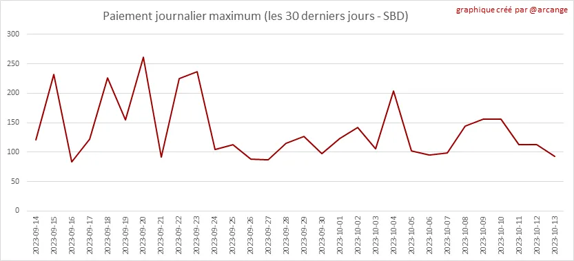 Ce graphique montrent la récompense maximale payée sur un message (ou un commentaire) au cours des 30 derniers jours.