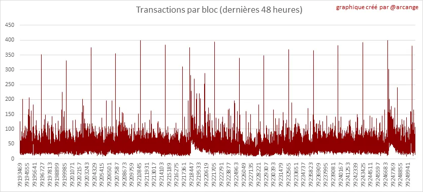 Ces graphiques montrent le nombre de transactions par jour, le nombre le plus élevé de transactions par bloc, le nombre moyen de transactions par bloc et le nombre de transactions par bloc au cours des 48 dernières heures. Cela vous donne une idée de toute l'activité sur la blockchain.