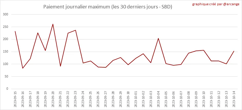 Ce graphique montrent la récompense maximale payée sur un message (ou un commentaire) au cours des 30 derniers jours.