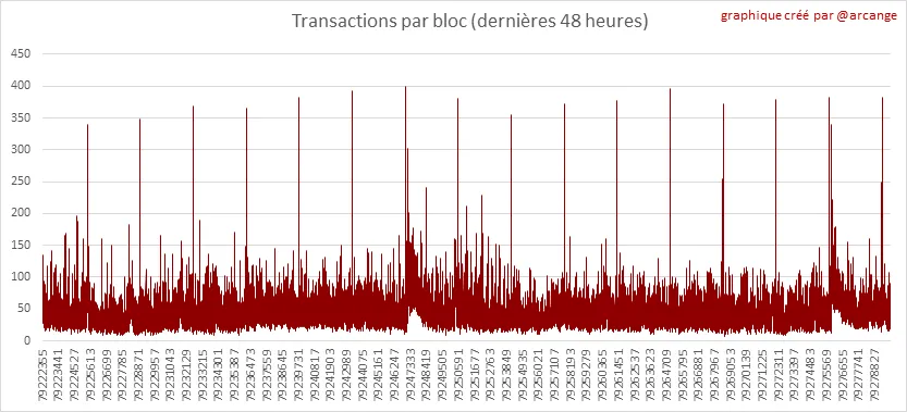 Ces graphiques montrent le nombre de transactions par jour, le nombre le plus élevé de transactions par bloc, le nombre moyen de transactions par bloc et le nombre de transactions par bloc au cours des 48 dernières heures. Cela vous donne une idée de toute l'activité sur la blockchain.